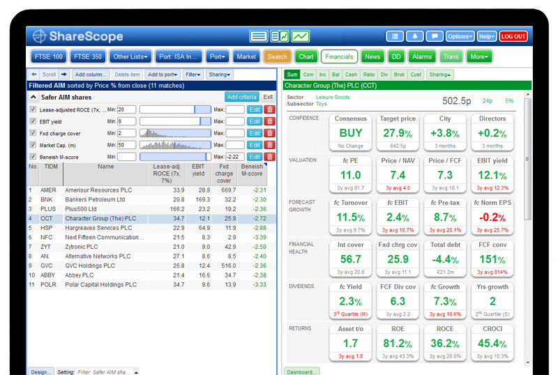 Our aim is to make investment research fast and easy. ShareScope's flexible split-screen format means that you can scroll down a list of shares on the left hand side of the screen and see the chart or financials for each stock on the right hand side of the screen.