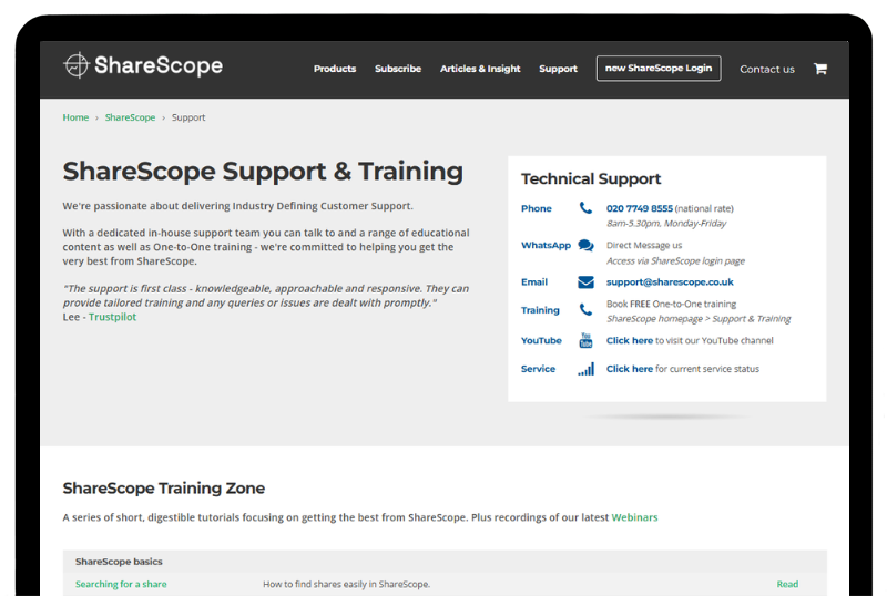 Whilst other companies route your support queries abroad or only respond by email, our friendly in-house customer support team is dedicated to helping you get the best out of ShareScope.