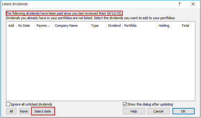 You can see at the top of the Latest dividends dialog that date since you last reviewed your dividends is usually set to today's date, in this case 9/12/15.