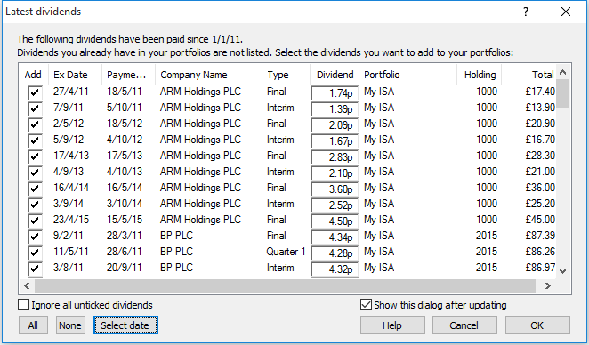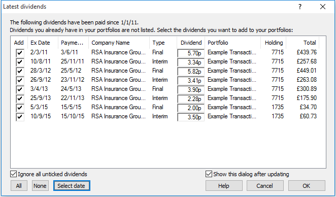 Whilst ShareScope is configured to add dividends to your portfolios on an on-going basis, it will not automatically add historical dividends to your portfolio. However, you can prompt ShareScope to do this.