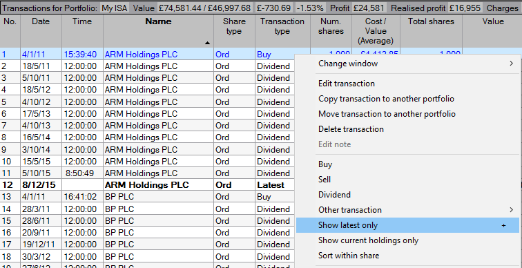You may also only wish to display only those shares for which you have a current holding. You can see the option Show current holdings only on the menu above. This can be applied in both the Transaction and Portfolio views.
