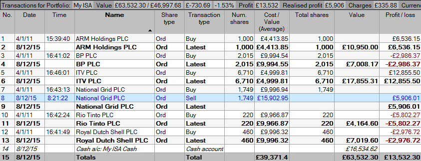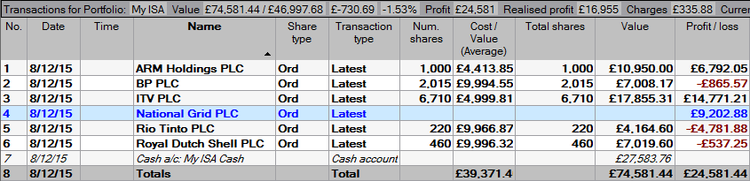 Here we have added purchases for BP, ITV, National Grid, Rio and Royal Dutch Shell. You can see that the cash balance is now down to just £631.67 and the portfolio is making an overall profit of £14,326.66