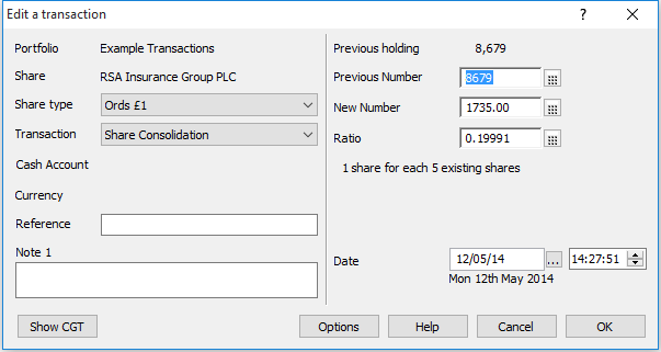 On 26/03/2014 RSA had a 9 for 8 Split and on 12/05/14 it had a 1 for 5 Consolidation. So both of these need to be recorded in our portfolio.