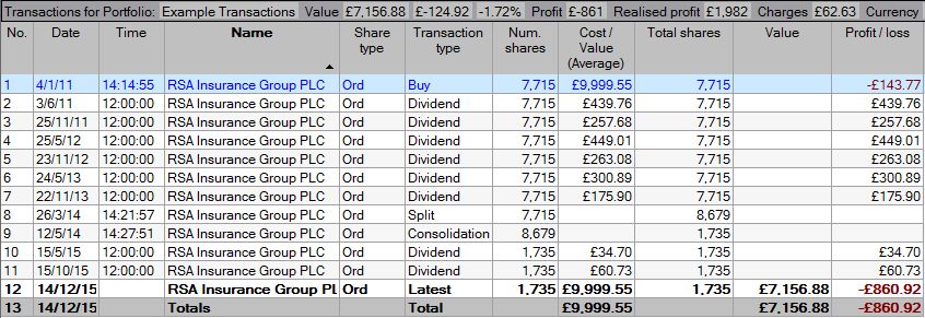 In this particular portfolio we have recorded a purchase of 7715 shares in RSA Insurance Group PLC (RSA) on 04/01/11 for £9999.55.