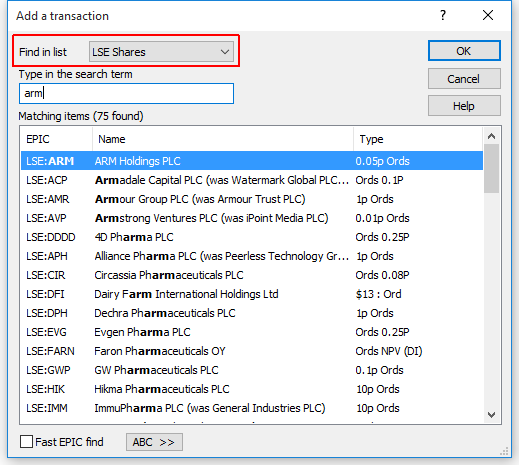 Type the name or EPIC/TIDM of the share and the Add a transaction window will open.
