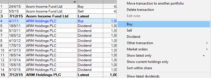 Select one of the transactions for the share. Right click and then select Buy from the menu.
