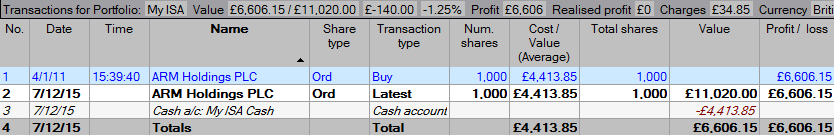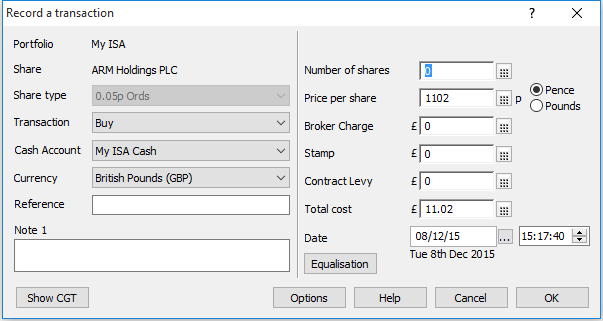 Here we have entered details of a purchase of 1000 shares in Arm Holdings PLC (ARM) we paid 437.9p/share, a Broker Charge of £12.95 and £21.90 stamp duty. The transaction is recorded as having occurred on 04/01/2011.