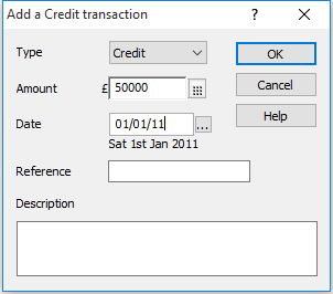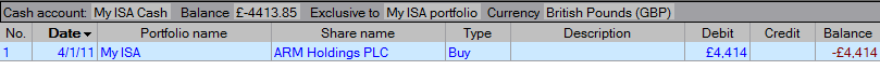 Here we have entered £50000 as our starting cash total and set the date as 01/01/11 which is before our purchase of Arm holding which occurred on 04/01/11.