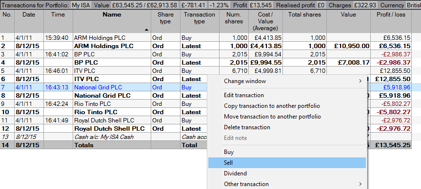 Here we have input details of the sale of our holding of National Grid. You can see that the sale has been processed for a profit of £15,906.01.