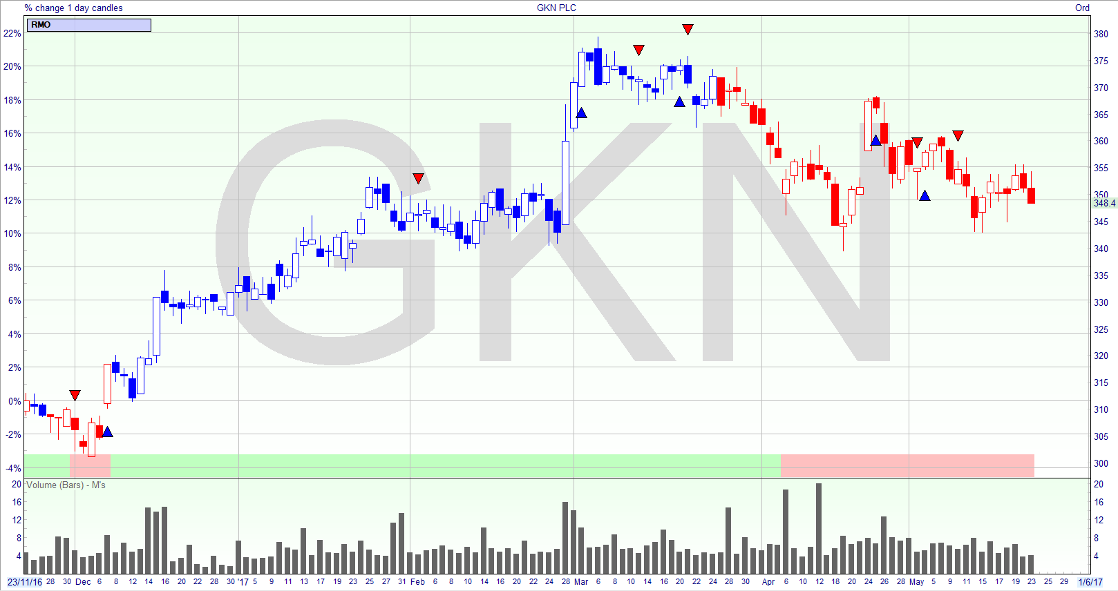 The Rahul Mohindra Oscillator (RMO) is being drawn in this example. You can see a ribbon is being drawn across the bottom of the chart, the candlestick colours are being determined by the study and it is also drawing arrows on the chart.