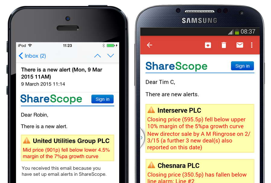 To save you having to check your investments all the time, ShareScope lets you set alarms to inform you of unexpected price movements and events that could affect the value of your investments (e.g. news stories, a reduction in profit forecasts, directors selling shares). Receive alerts on your phone via email so you can react quickly wherever you are.