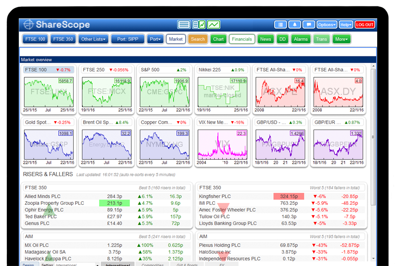 ShareScope includes a broad range of market data - UK and US shares, global indices, funds, bonds, commodities, currencies and economic indicators. Our Market Overview provides an easy way to see what's happening around the world - a great place to start first thing in the morning. You can customise this view to display the information you are most interested in. For example, add the top risers and fallers in your portfolios.
