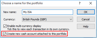 To create a new portfolio, click on the Select Portfolio button or press F12. At the bottom of the dialog, there is an option titled Create new cash account attached to this portfolio.