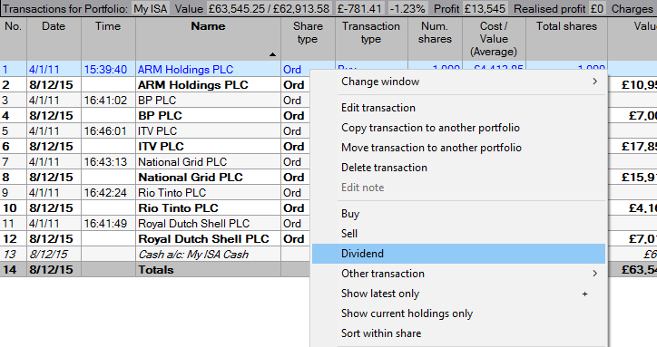 To record a dividend, highlight the share (or transaction) and then right-click and select Dividend from the menu.