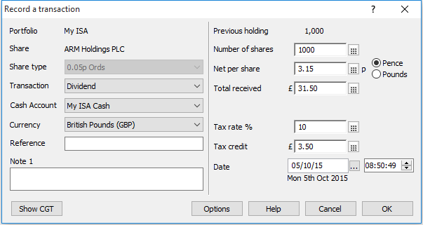The number of shares will already be populated so we have just entered the Net per share value of 3.15p and the date 05/10/15.