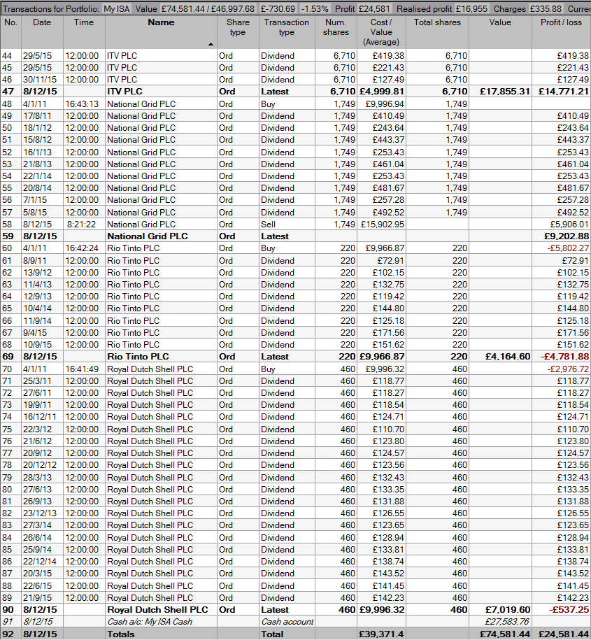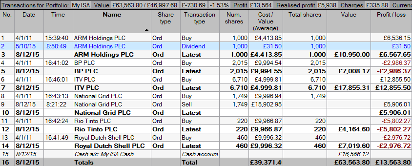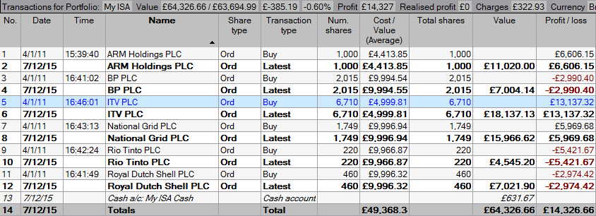 Here we have added purchases for BP, ITV, National Grid, Rio and Royal Dutch Shell. You can see that the cash balance is now down to just £631.67 and the portfolio is making an overall profit of £14,326.66