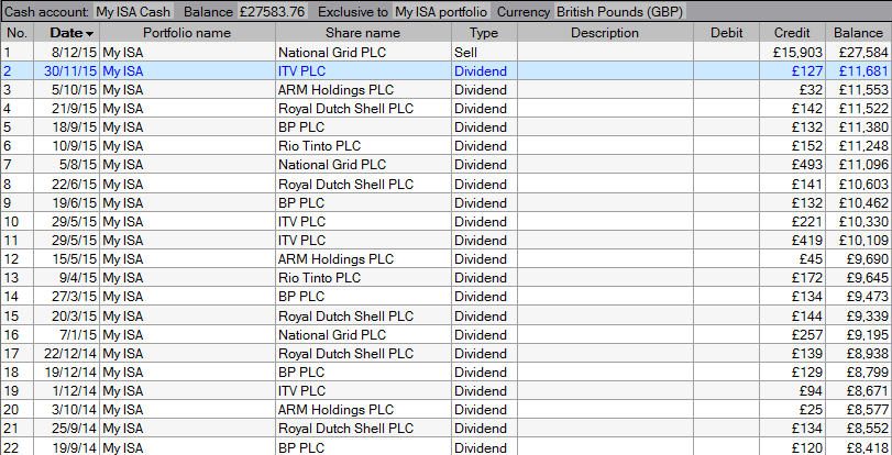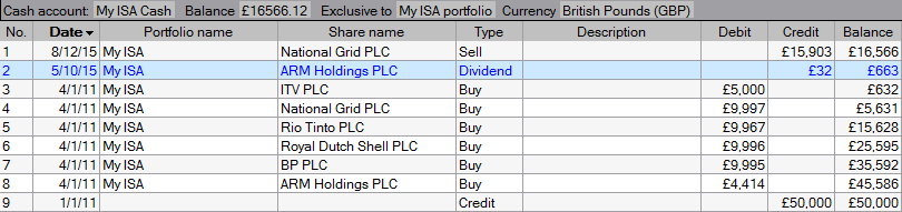 You can also see that all of the dividends have been applied to the Cash account. You may recall that after the purchase of all of our shares we had £631 in the cash account. You can see that prior to the sale of National Grid the Cash Balance was £11,681 so just over £11,000 in dividends has been added to the account in since the beginning of 2011.