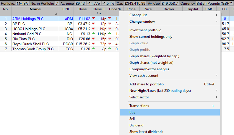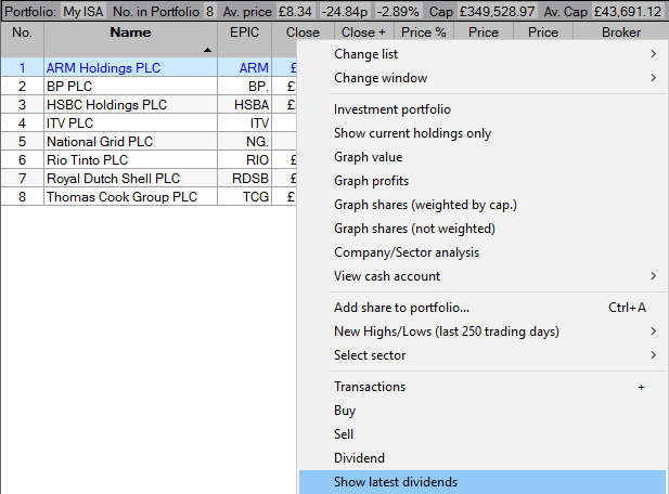Here you can see that we have turned on the Show Current holdings only option in our Portfolio view. National Grid, which we have sold, is no longer shown in the list.