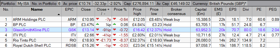 You can also see that we have added GlaxoSmithKline PLC (GSK) to the portfolio. As there are no holdings recorded for GSK it should not be shown in the list. However, in order to allow you to record transactions against it the share will be shown until the program is restarted or the data is reloaded. Shares added in this way will be coloured purple as a reminder of this.