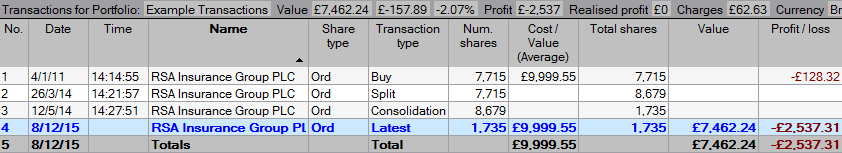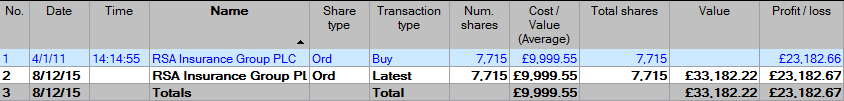 In this particular portfolio we have recorded a purchase of 7715 shares in RSA Insurance Group PLC (RSA) on 04/01/11 for £9999.55.
