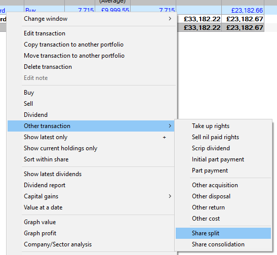 Make sure you have one of the transactions for the share selected, right click, select Other transaction and then Share Split from the sub-menu.