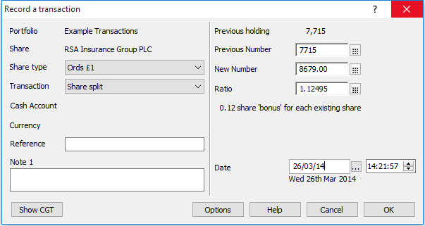 On 26/03/2014 RSA had a 9 for 8 Split and on 12/05/14 it had a 1 for 5 Consolidation. So both of these need to be recorded in our portfolio.