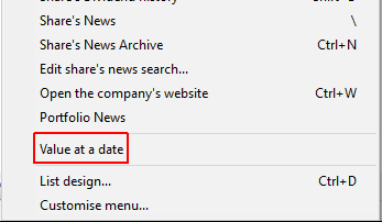 You can see on the section above that the option for Value at a date on the menu on the Transaction screen is just above. You can see on the section above that the option on the menu on the Transaction screen is just above Graph value and Graph Profit.
