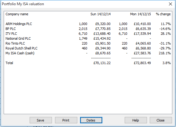 Using the Dates button we have added a previous date, 14/12/14, as a comparison so we can see how the individual shares in the portfolio have performed over that period and how the portfolio as a whole has performed over that period.