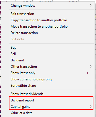 Just above the Value at a date option on Transaction screen menu are the options for Dividend report and Capital gains.