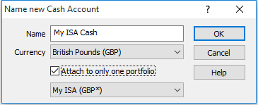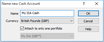 Give the new cash account a name, tick the Attach to only one portfolio option and make sure you select the correct portfolio from the drop-down list.