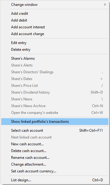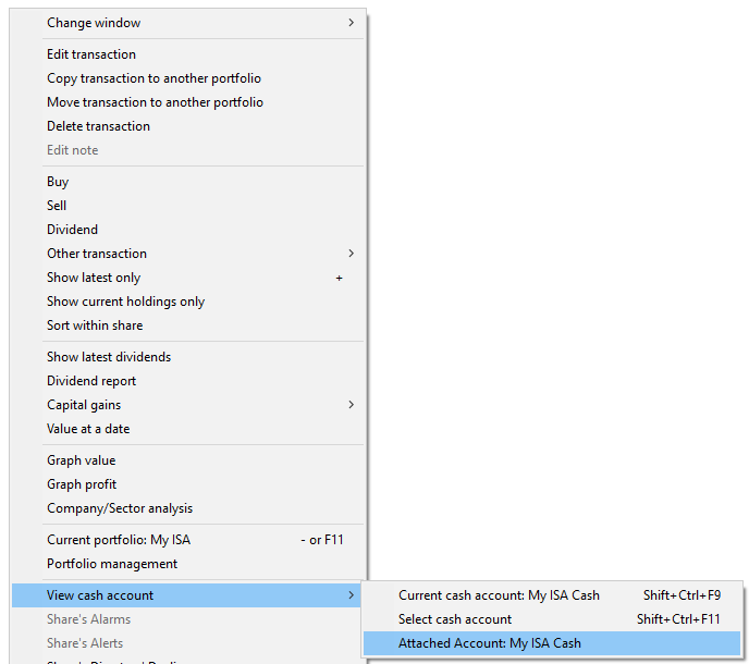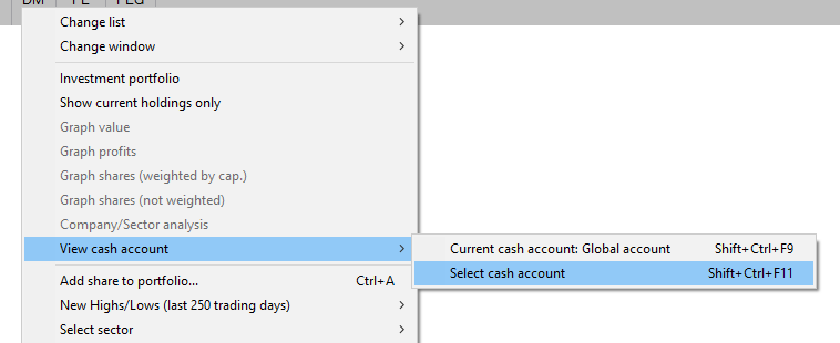 Right click on the Portfolio screen, move the mouse over View cash account and then click on Select cash account in the sub-menu.