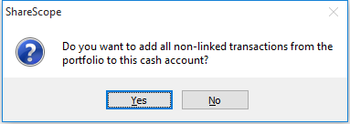 Once you click on OK then you will be asked if you wish to add all non-linked transactions from the portfolio to the cash account. If you have already recorded transactions in your portfolio then you should click on Yes.