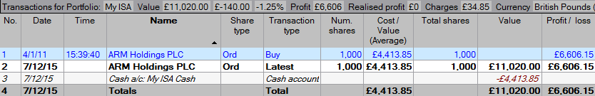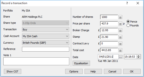 Here we have entered details of a purchase of 1000 shares in Arm Holdings PLC (ARM) we paid 437.9p/share, a Broker Charge of £12.95 and £21.90 stamp duty. The transaction is recorded as having occurred on 04/01/2011.