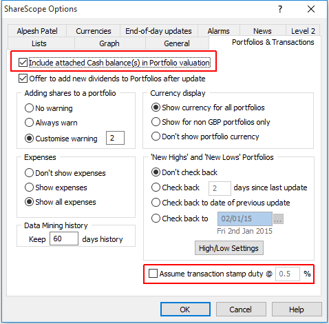 In addition to this, there is an option to Assume transaction stamp duty @ 0.5 %. If you tick this, ShareScope will automatically calculate the stamp duty of your purchase transactions for you.