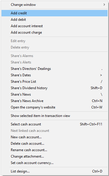 ShareScope provides Cash Accounts that can be attached to a portfolio and will then reflect any credits or debits made into the account. For example a credit may come from a dividend payment, the disposal of shares or money paid into the account from an external source.