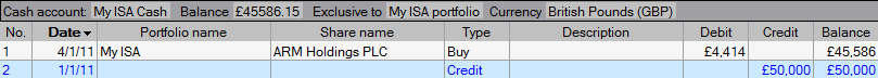 Here we have entered £50000 as our starting cash total and set the date as 01/01/11 which is before our purchase of Arm holding which occurred on 04/01/11.