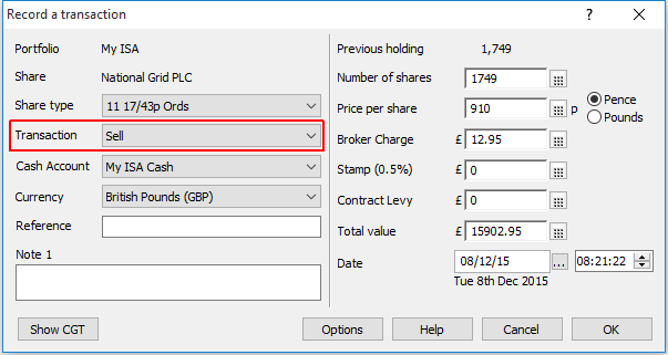 The dialog that opens is the same as the Buy transaction dialog; only this time, the Transaction type has been changed to Sell.